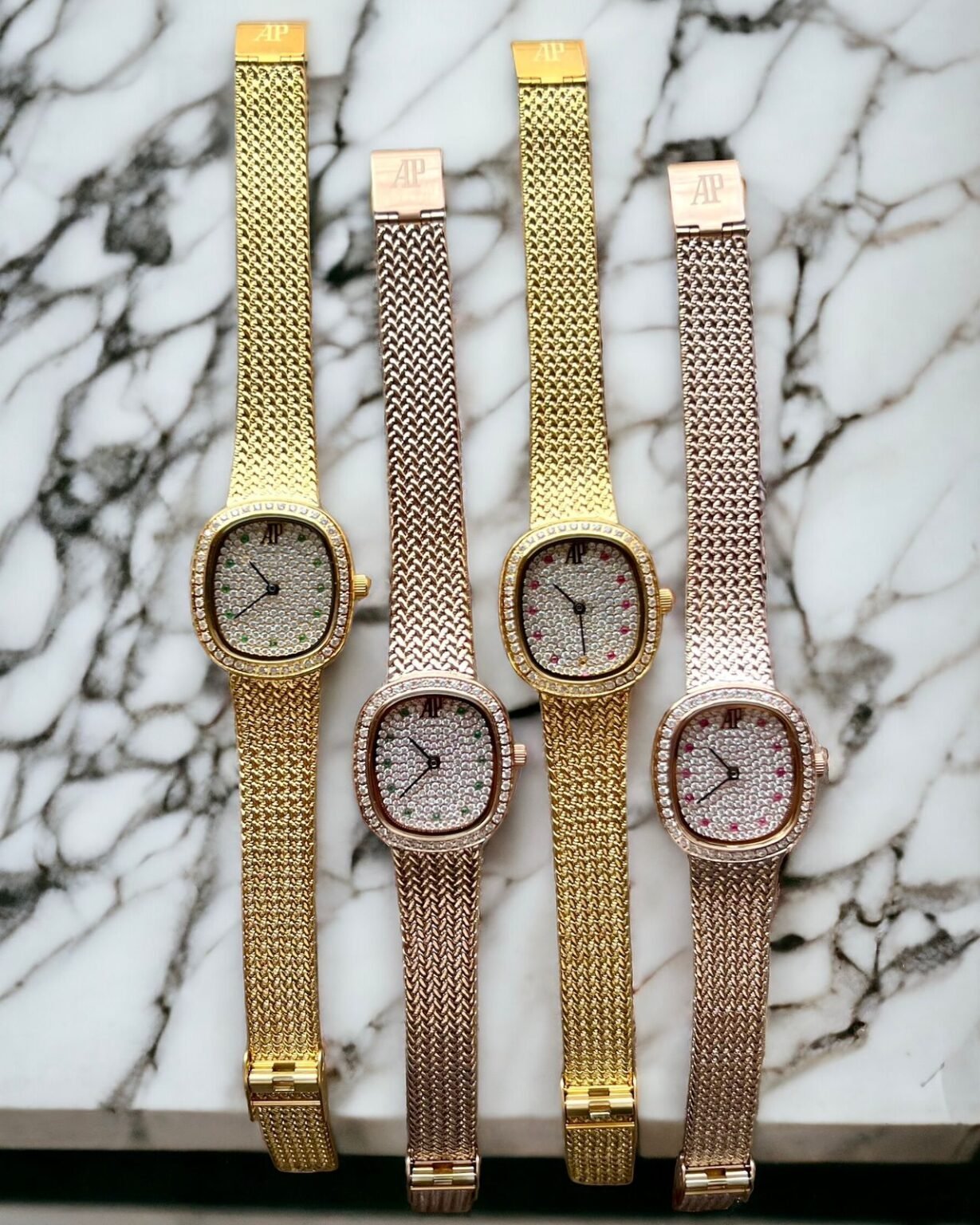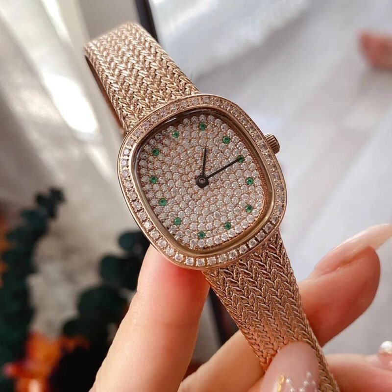 👉🏽 Features: Powered by original Japanese quartz machinery, Stainless-steel Rose gold case, Sapphire glass on a White diamond dial with cannage Diamond and silver hands, fastened by a stainless-steel Rose gold mesh strap with Geometric cannage lines, with a deployment clasp.