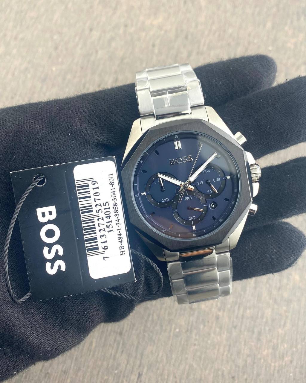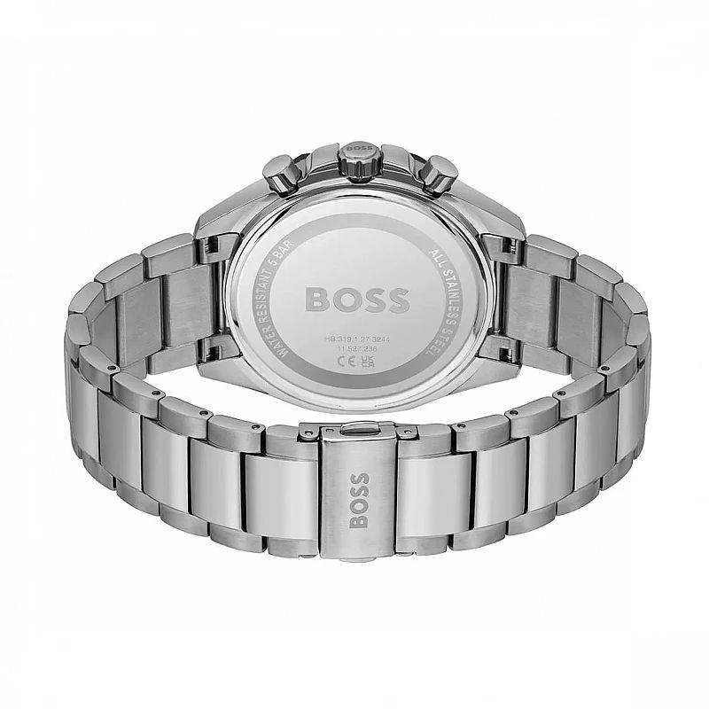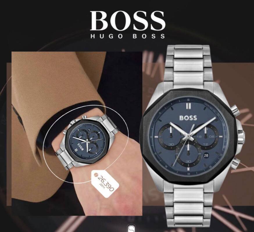 *Push yourself beyond your own limits to perfect your performance. The BOSS Velocity is for those who strive day after day to beat the best of the best. This stylish sports chronograph features a 44mm silver Stainless steel Plated case, Black redy bezel, blue dial, Silver metal belt with BOSS branding and BOSS buckle.