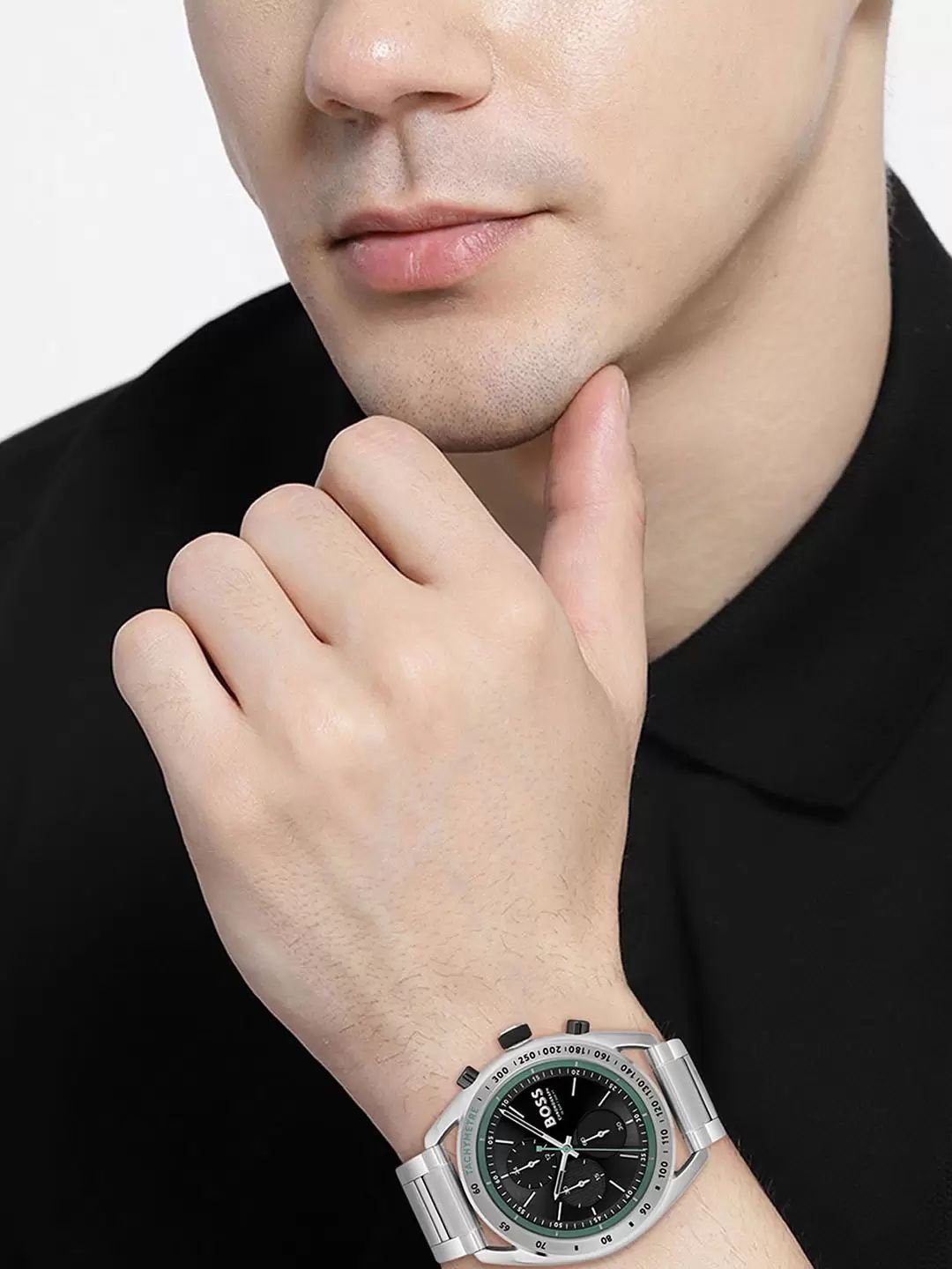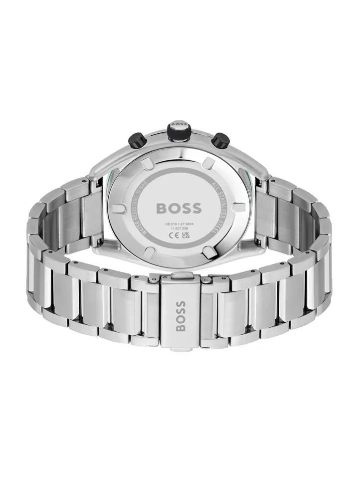 *Push yourself beyond your own limits to perfect your performance. The BOSS Velocity is for those who strive after to beat the best of the best. This stylish sports chronograph features a 44mm Copy Stainless steel Plated case, silver redy bezel, Black dial, Silver metal Blet with BOSS branding and BOSS buckle.
